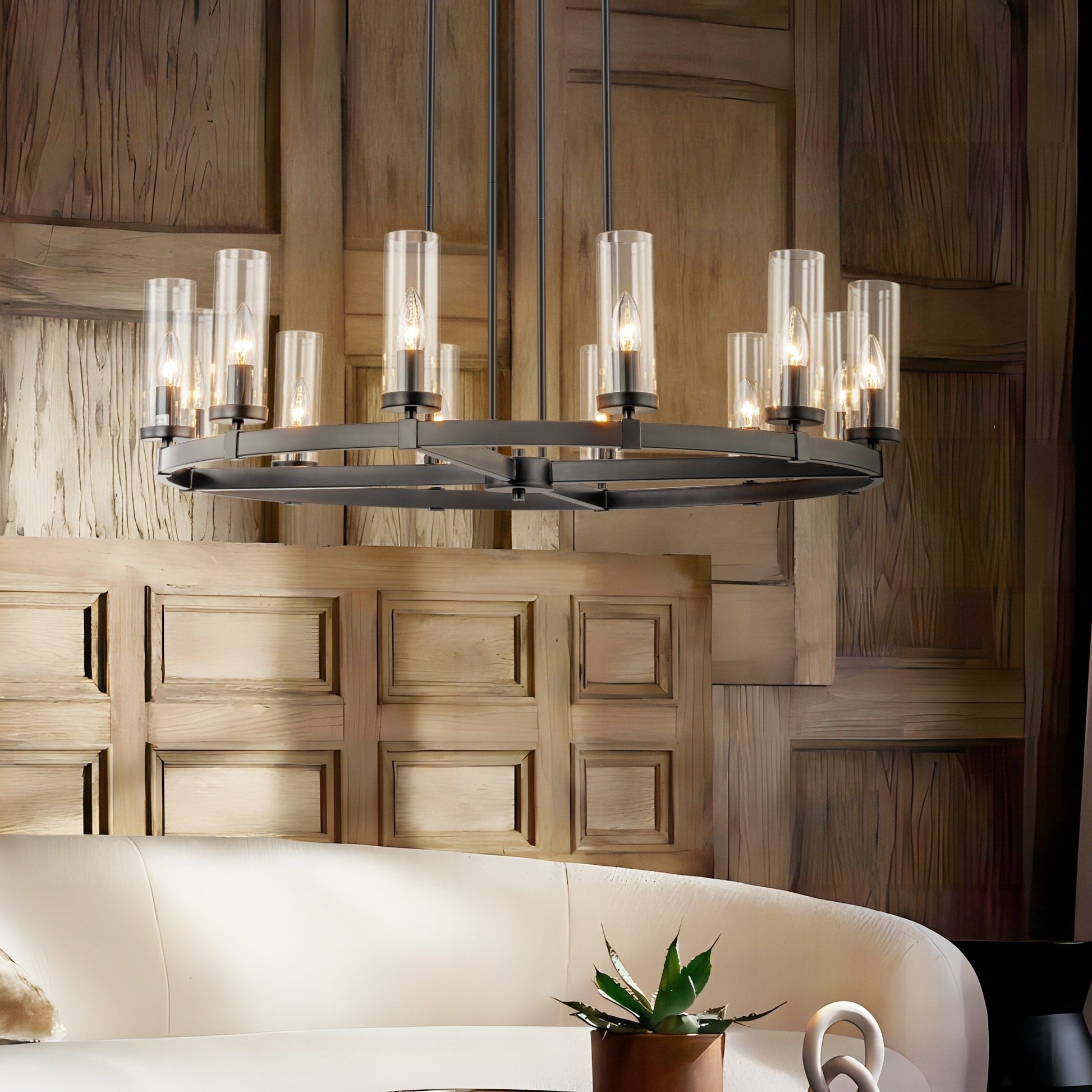 This 12-light retro industrial circle wagon wheel chandelier clear glass island light with a 35.4-inch diameter stands as a testament to unparalleled craftsmanship and design ingenuity. The lighting goes through the pure-clear glass shade and imparts a soft and ample illumination, casting a luminous aura that gracefully envelops your living space. Meanwhile, this opulent fixture showcases a distinctive wheel-shaped frame and elegantly cylinder candlestick-style bulbs (not included) design, exuding a commanding presence with a pronounced vintage industrial aesthetic.