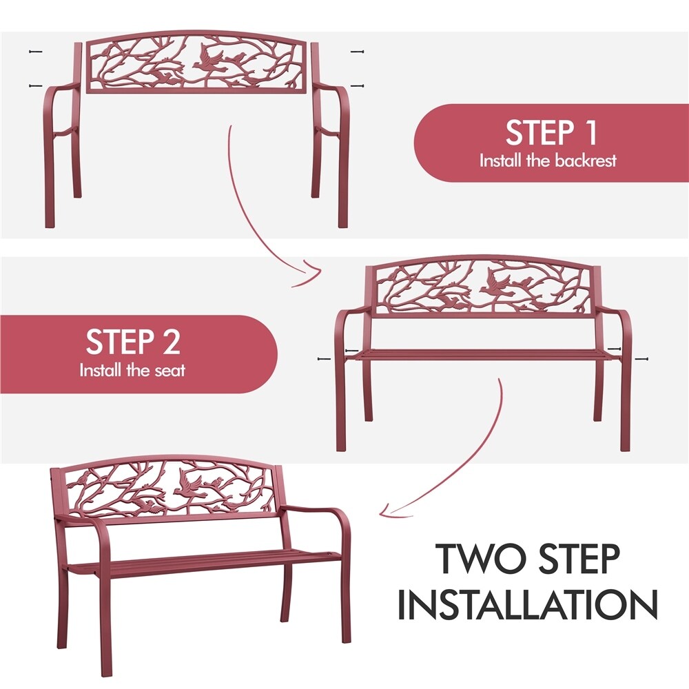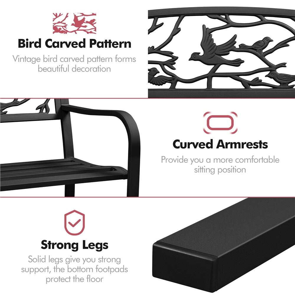 Bring a touch of nature to your outdoor living space with our Yaheetech 50' Patio Garden Bench. The vintage bird pattern on the backrest adds beauty and allows airflow, while the slightly curved seat is wide and deep for comfortable sitting. Made of sturdy iron with a protective waterproof coating, this bench is heavy-duty-oriented and durable enough for long-term usage. With a maximum load of 180kg/397lb, it's suitable for parks, backyards, gardens, wedding settings, and more. The armrests are curved for comfort, and the seat is thoughtfully designed with vertical stripes for better circulation and weight distribution. All-weather finish ensures durability in any weather condition, and assembly is easy with included tools and instructions.
